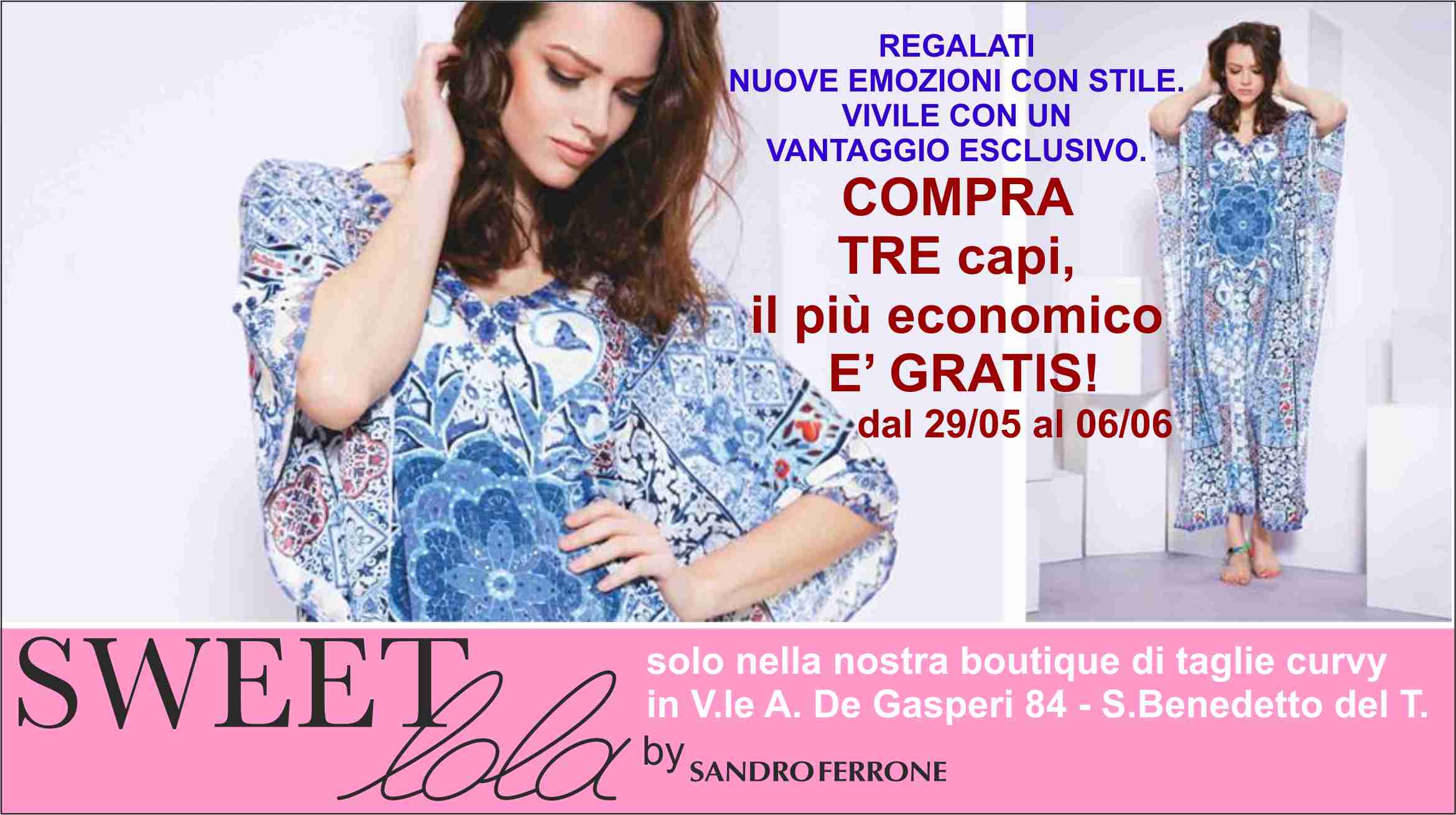 Compra tre capi, il più economico è gratis. Da Sweetlola by Sandro Ferrone