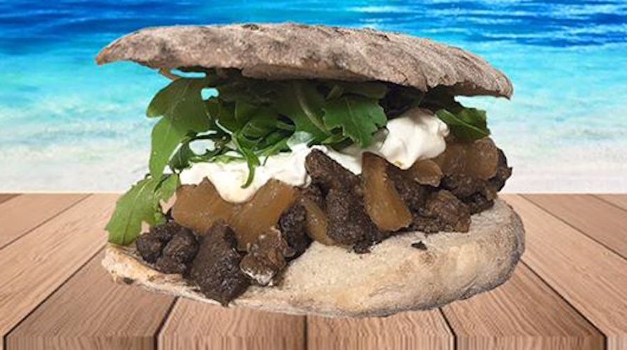 Pane cotto su pietra, straccetti di capocollo speziati, yogurt greco, ananas caramellato e rucola. Sapori esotici da non perdere.
