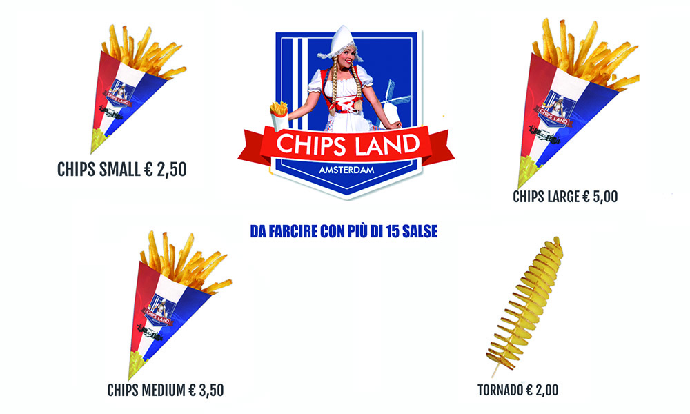 Chips Land è un franchise conosciuto ormai in tutto il mondo, giunge oggi anche a San Benedetto per offrire ai propri clienti l’unica ed autentica patatina olandese, in più varianti, tutte abbinabili a più di 15 salse: