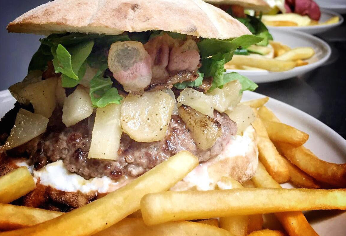 Pane cotto su pietra, hamburger di scottona, mousse di ricotta e pecorino, guanciale croccante, pere caramellate al vino, rucola.