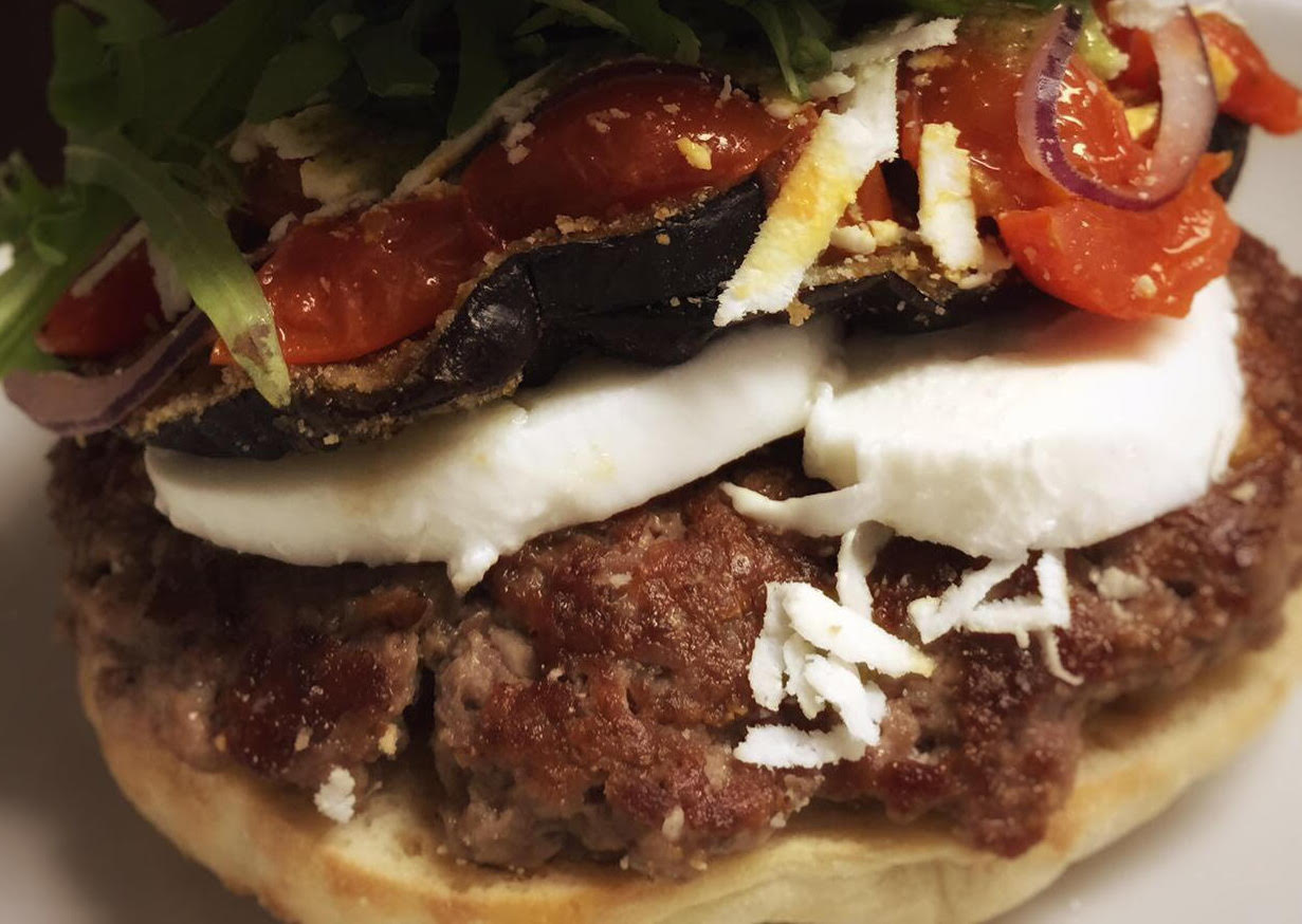 Prova il panino di giugno: hamburger di scottona, melanzana gratinata al forno, mozzarella, pomodorini spadellati, olio aromatizzato al basilico (naturalmente homemade), rucola, ricotta stagionata.