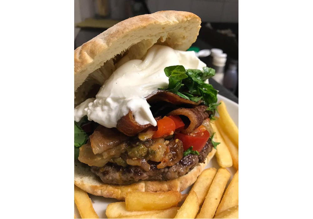 Ecco il panino del mese: hamburger di scottona da 200gr, caponata, burrata artigianale, guanciale croccante e rucola.