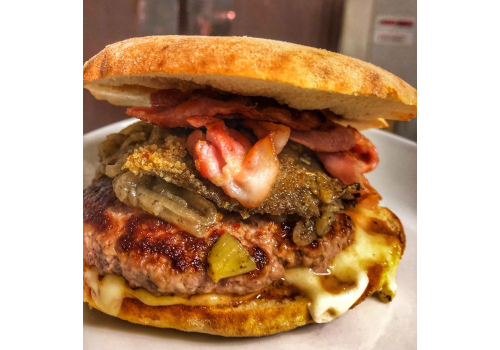 Ecco il panino del mese: pane cotto su pietra, hamburger di scottona, provolone piccante, fungo pleurotus gratinato, cipolla stufata al tartufo e l’immancabile bacon croccante.