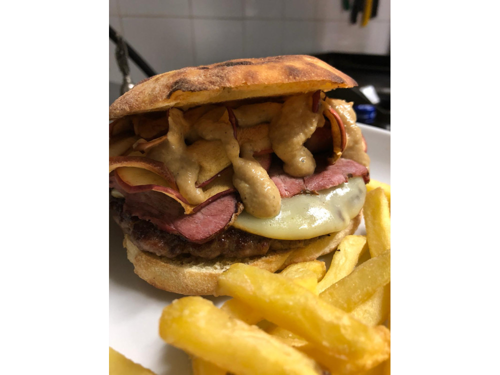 Ecco gli ingredienti: pane cotto su pietra; hamburger di marchigiana da 200gr; provolone; capocollo affumicato al ciliegio; mele grigliate; salsa alla senape e cipolle caramellate.