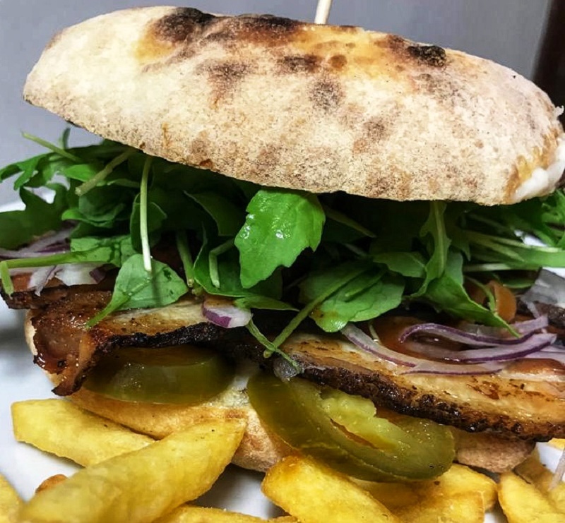 Ecco gli ingredienti: Pane cotto su pietra, Pancia di maiale affumicata al melo, Jalapeño,  Pecorino fresco Cipolla fresca Rucola e Salsa Barbecue Birritrovo.