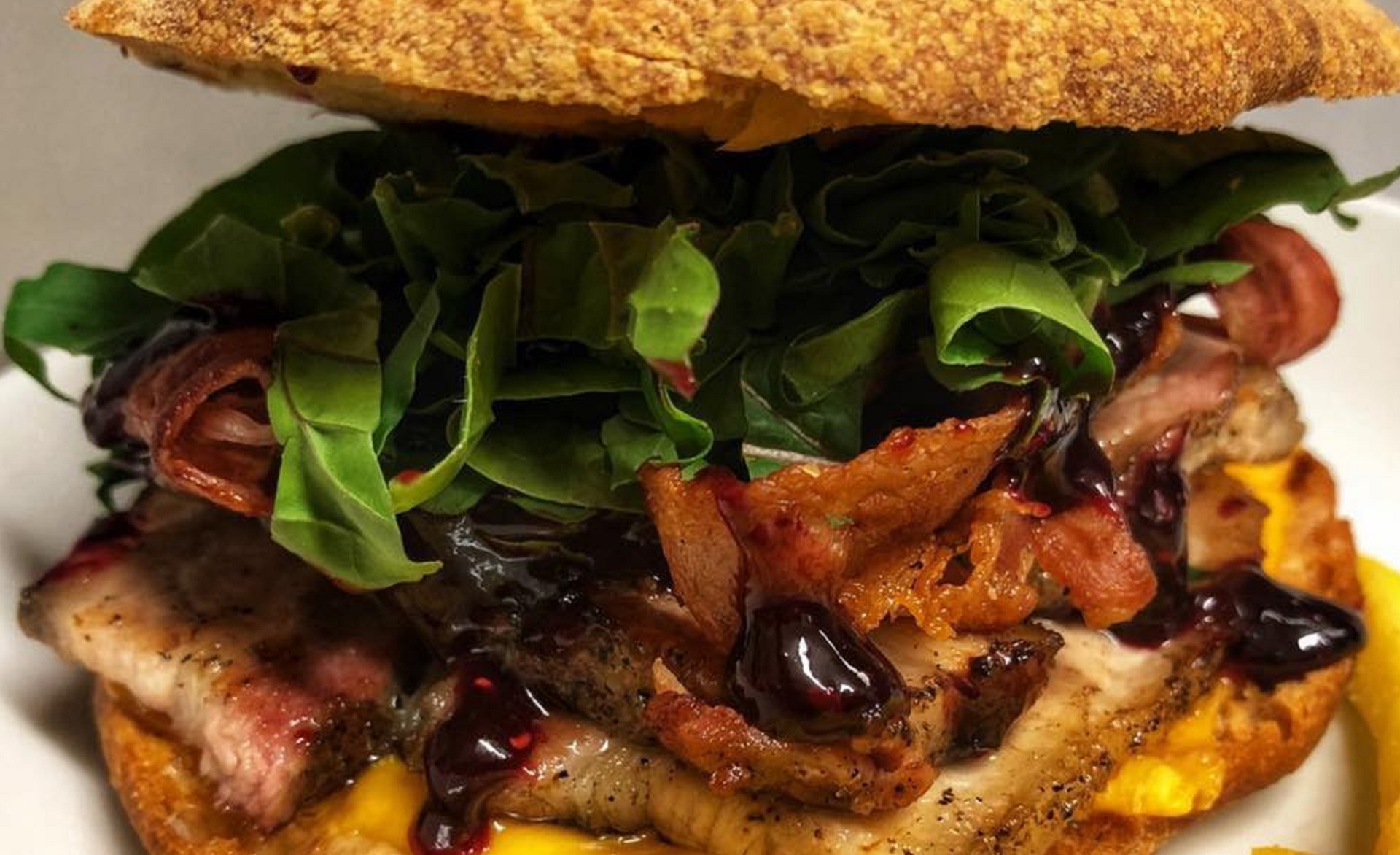 Ecco tutti gli ingredienti: pane cotto su pietra, pancia di maiale affumicata al ciliegio, cheddar, burro d’arachidi crunchy homemade, bacon croccante, salsa barbecue ai frutti di bosco, rucola fresca.