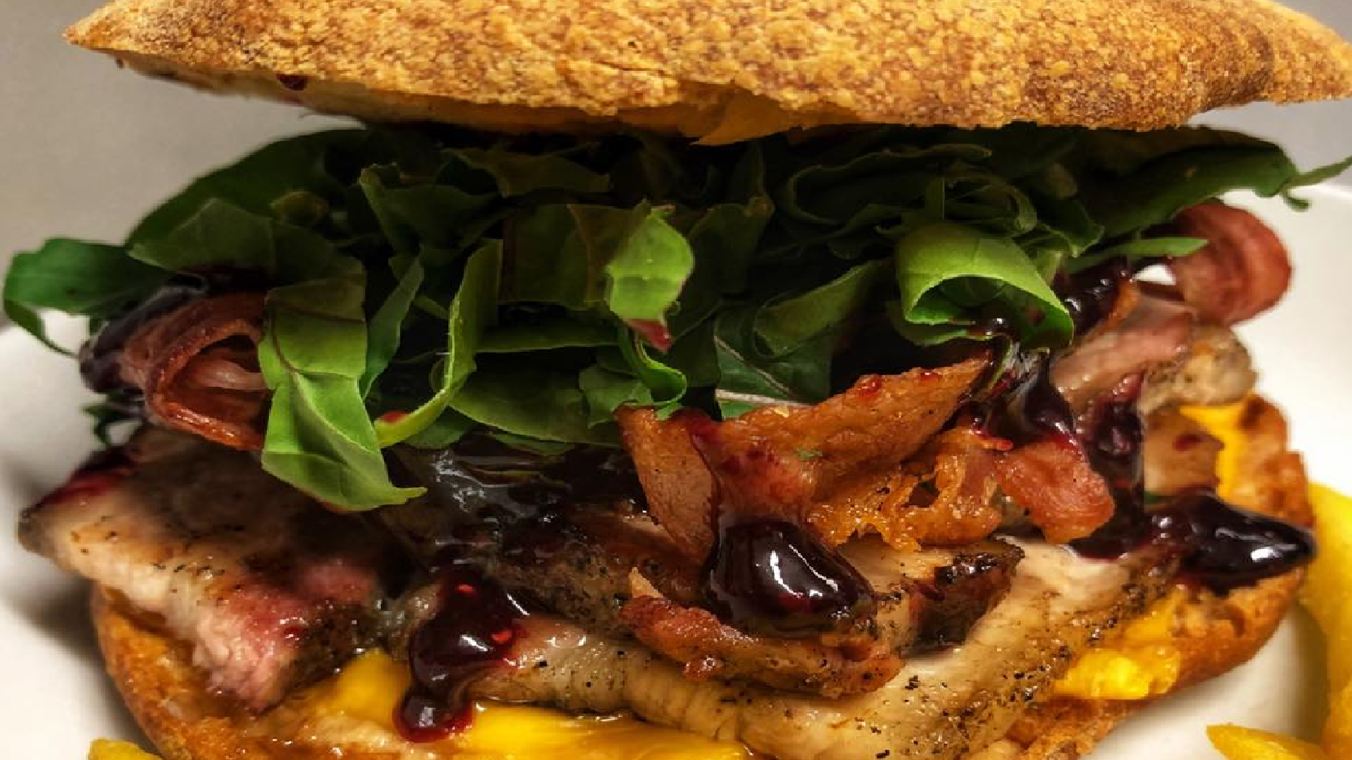 Ecco gli ingredienti: pane cotto su pietra, pancia di maiale affumicata al melo, cheddar, burro d’arachidi crunchy, bacon croccante, salsa barbecue ai mirtilli fatta in casa, rucola fresca.