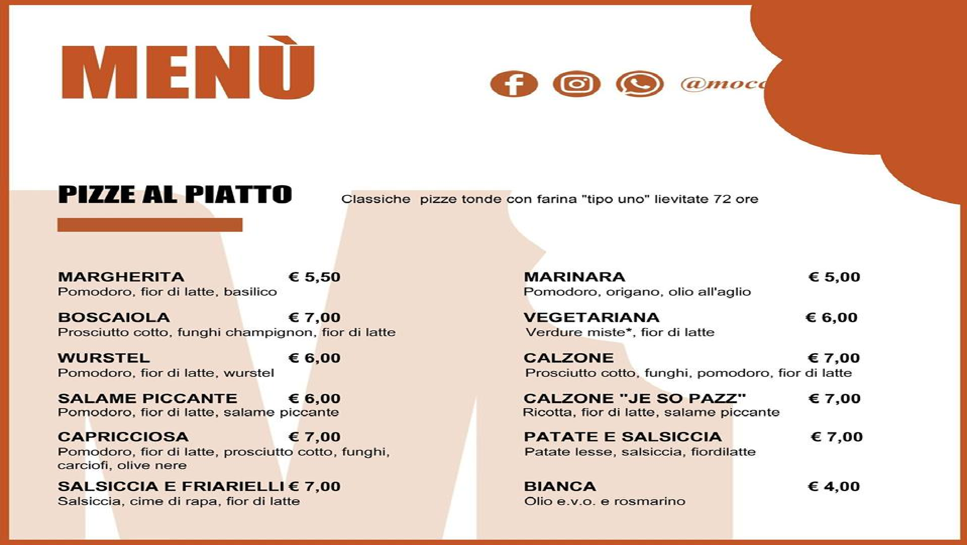 Hai voglia di pizza? Da Moccico puoi trovare le pizze classiche: impasto con farina tipo 1 e pochissimo lievito, lievitate almeno 72 ore per renderle soffici, saporite e digeribili.