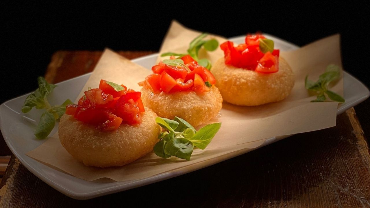 Ecco a voi “Scugnizze”, una nuvoletta fritta condita con pomodorini, basilico fresco e olio evo.