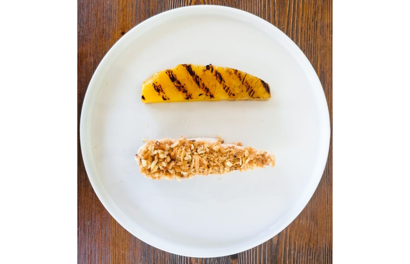Pollo, crema di arachidi, pane croccante e ananas arrosto.
