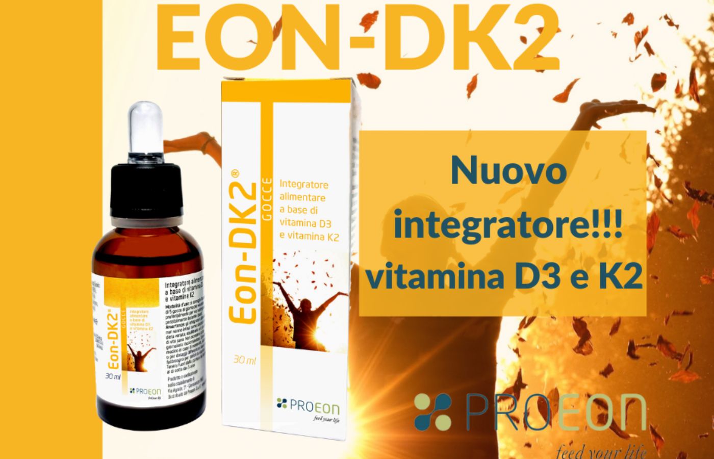un integratore alimentare in gocce a base di vitamina D3 (Colecalciferolo) e vitamina K2, (Menachinone), del tipo MK-7 da fermentazione naturale, in olio di vinaccioli, con i rinomati standard qualitativi di eccellenza PROEON!