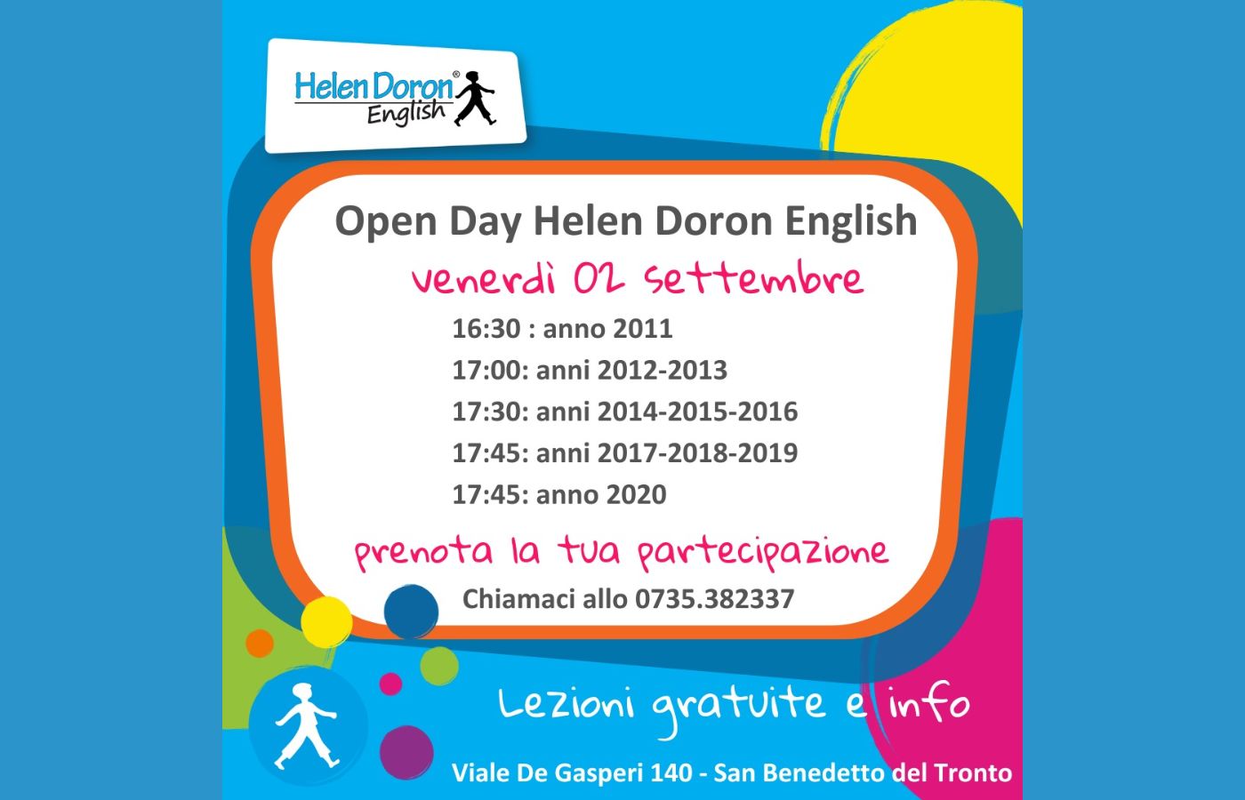 Venerdì 2 settembre Helen Doron English apre le sue porte a tutti coloro che vogliono sapere di più sul metodo e sui nuovi corsi per l’anno 2022-2023. Lezioni gratuite per tutte le età, basta chiamare e prenotare!