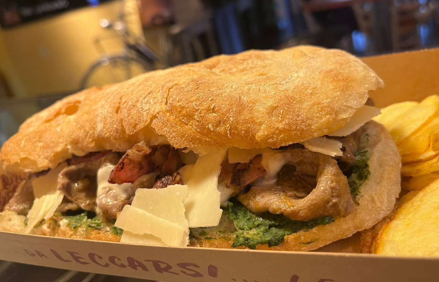 Ecco il panino Heal, con Pan de Coca, scaloppa di Angus, crema di cicoria e patate, bacon, crema al formaggio e scaglie di Pecorino Romano.