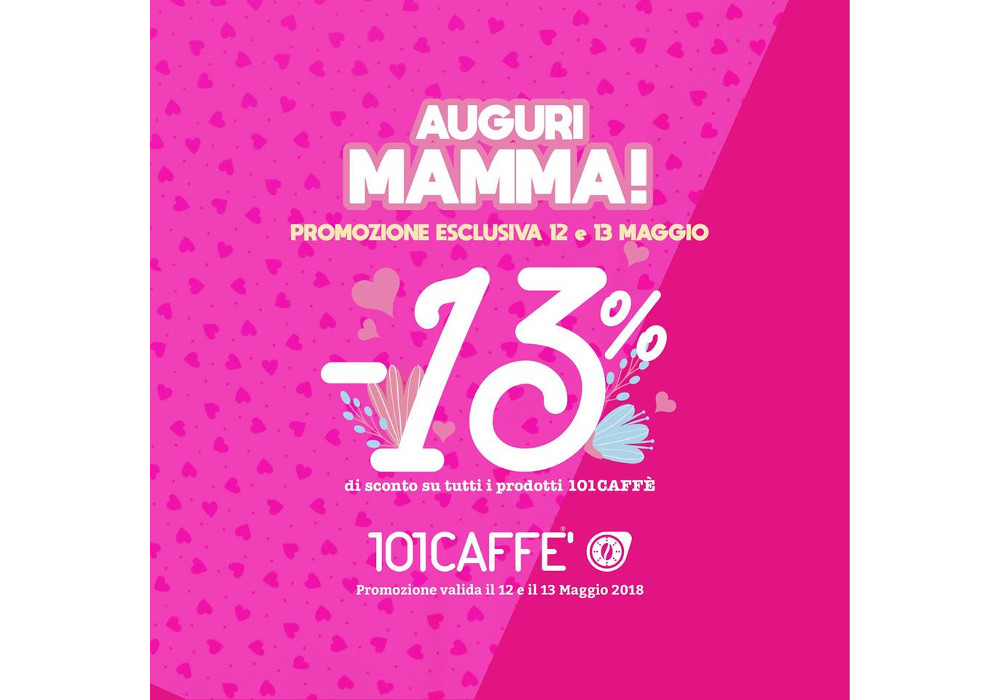 Quest’anno la Festa della Mamma è il 13 maggio e 101Caffè ha deciso di dedicarle 2 giorni speciali: sabato 12 e domenica 13 vai in negozio e ricevi subito il 13% di sconto su qualsiasi importo che spenderai in prodotti 101Caffè!
