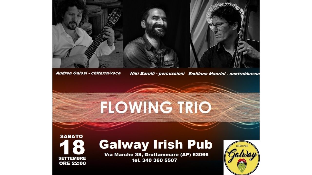 Alle 22 saliranno sul palco i Flowing Trio, composto da Andrea Galosi alla chitarra/voce, Emiliano Macrini al contrabbasso e Niki Barulli alle percussioni, con un repertorio di musica d’autore nazionale ed internazionale, soprattutto del periodo degli anni ’70, rivisitando i brani in una chiave acustica dal sapore jazzistico.