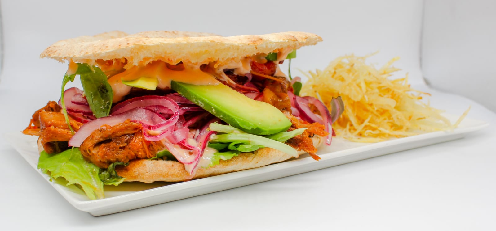 Pane pizza, misticanza, pulled pork, maionese al peperoncino, avocado, cipolla marinata.