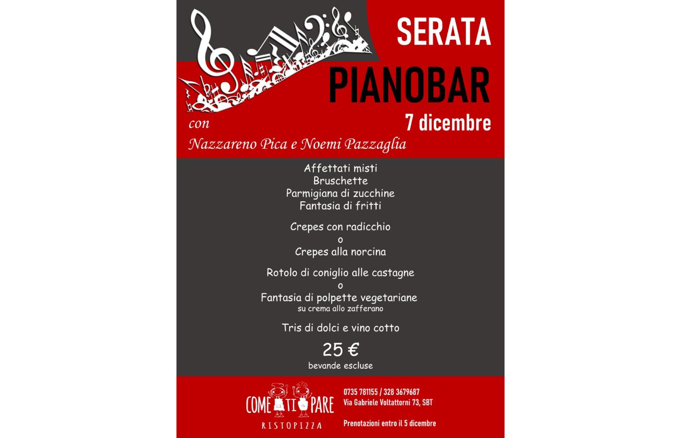 Giovedì 7 dicembre appuntamento con il divertentissimo piano bar di Nazzareno Pica e Noemi Pazzaglia.