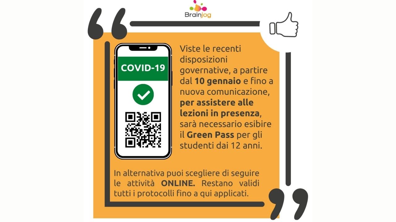 La scuola di lingue Brainjog informa che a partire da oggi, 10 gennaio, gli studenti dai 12 anni potranno partecipare alle lezioni in presenza solo se in possesso di Green Pass.