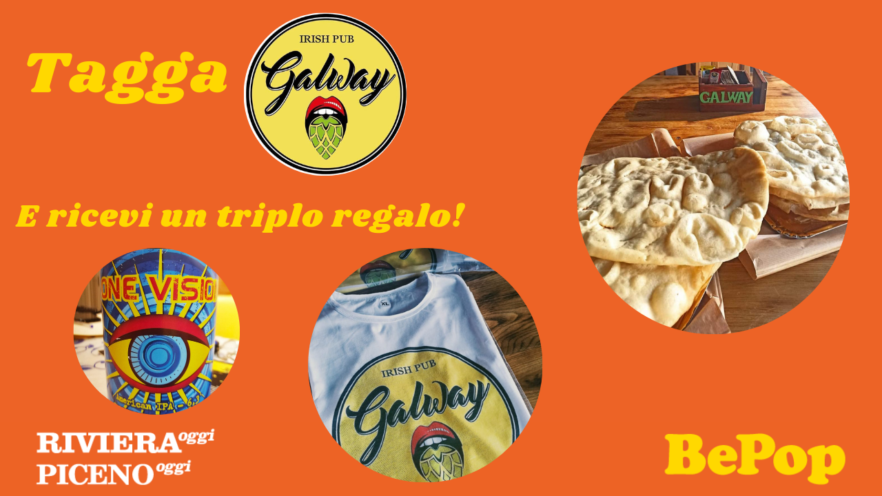 Galway Irish Pub si trova in via Marche, 38 a Grottammare ed è partnere di Riviera Oggi. Dai un’occhiata ai nostri canali Instagram e Facebook  e scopri come  puoi ottenere in regalo da Galway un Super Pack costituito da una T-Shirt personalizzata, una lattina di birra One Vision e una Super Frittella farcita con prosciutto crudo tagliato a mano!