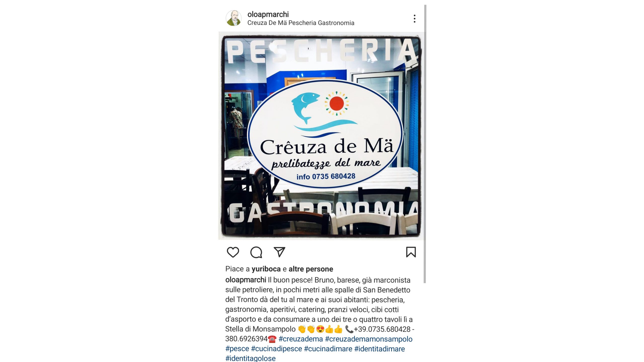 “Il buon pesce! Bruno, barese, già marconista sulle petroliere, in pochi metri alle spalle di San Benedetto del Tronto dà del tu al mare e ai suoi abitanti: pescheria, gastronomia, aperitivi, catering, pranzi veloci, cibi cotti d’asporto e da consumare a uno dei tre o quattro tavoli lì a Stella di Monsampolo”.
