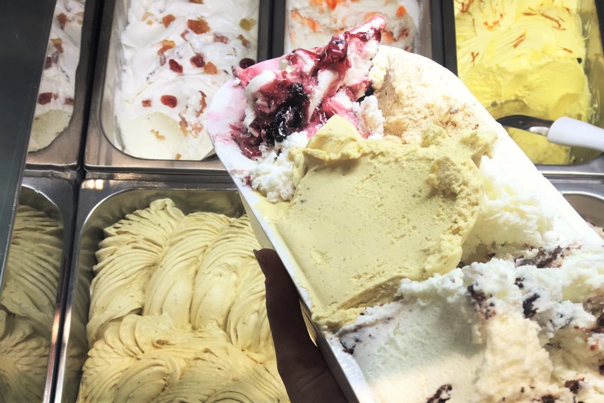 Ecco i gusti diponibili: Stracciatella, Cassata, Zafferano, Crema alla nocciola, cioccolato al latte, cioccolato fondente, crema, nocciola, bacio, fior di latte, amarena, variegato pesca e arancia, zenzero, yogurt, kaos, croccante, zuppa inglese, mandorla tostata, cannella, cioccolato all’arancia, limone, fragola. malaga, caffè, pistacchio di Bronte.