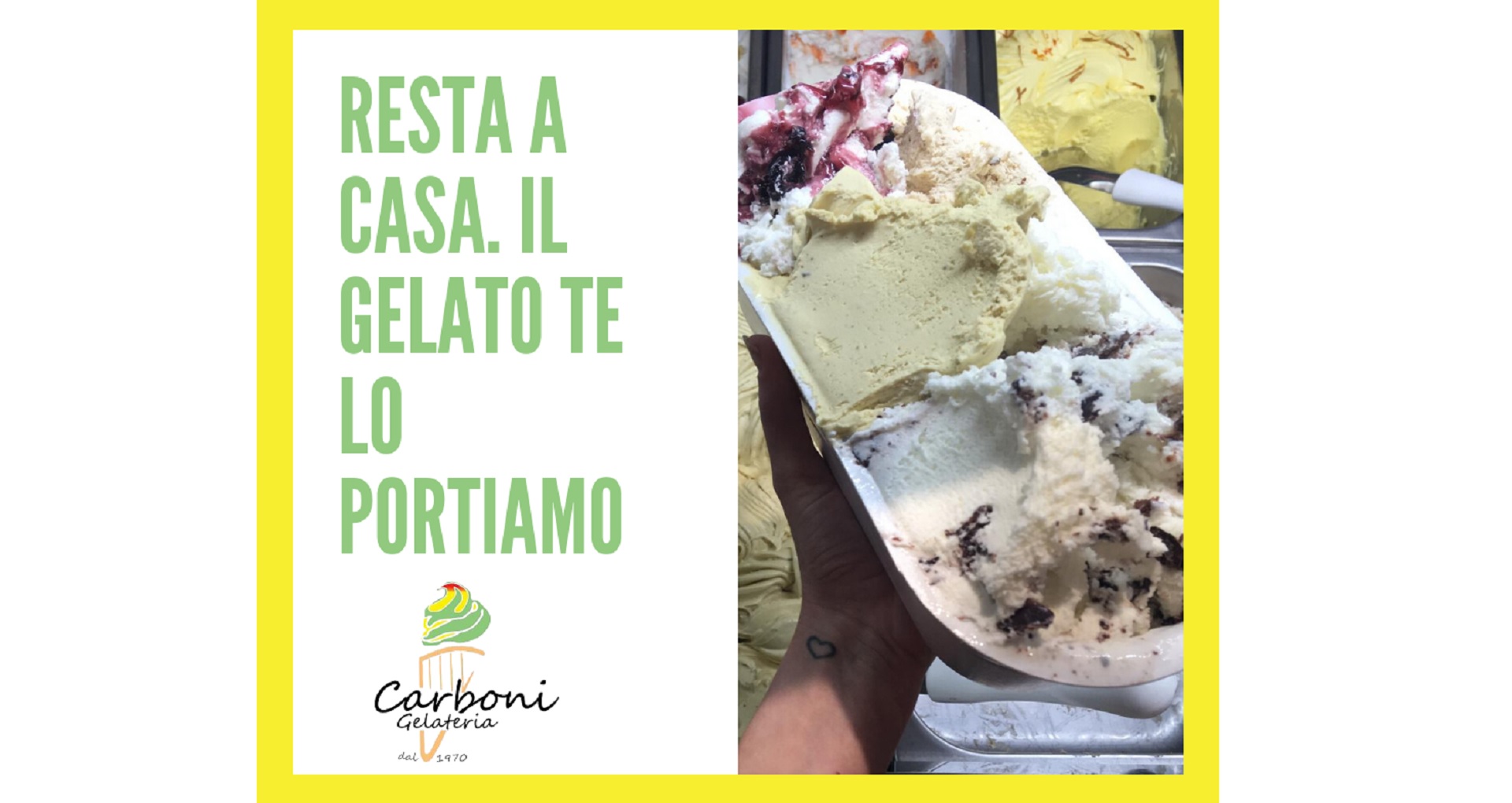 Con Gelateria Carboni potete ricevere il vostro gelato preferito direttamente a casa dalle ore 12 alle 21, telefonando allo 0735 582809 o mandando un messaggio su WhatsApp al 353-4054343.