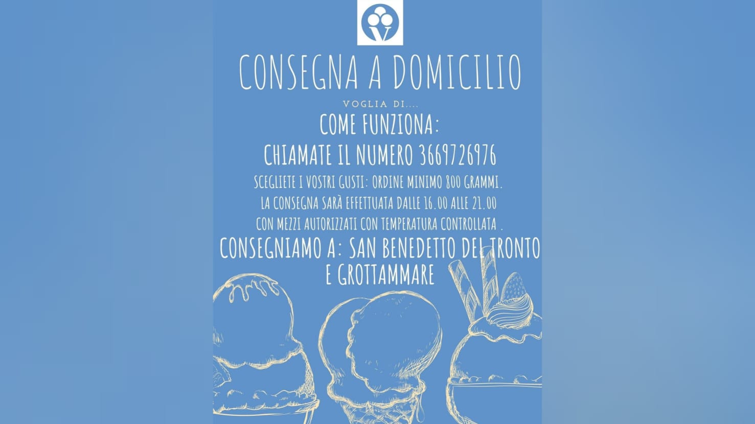 Chiama il 3669726976 e scegli i tuoi gusti. Le consegne saranno effettuate dalle 16 alle 21 a San Benedetto e Grottammare, con mezzi autorizzati con temperatura controllata.
