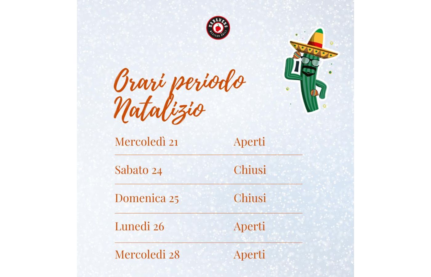 Habanero Mexican presenta i giorni di apertura nel periodo di festività!