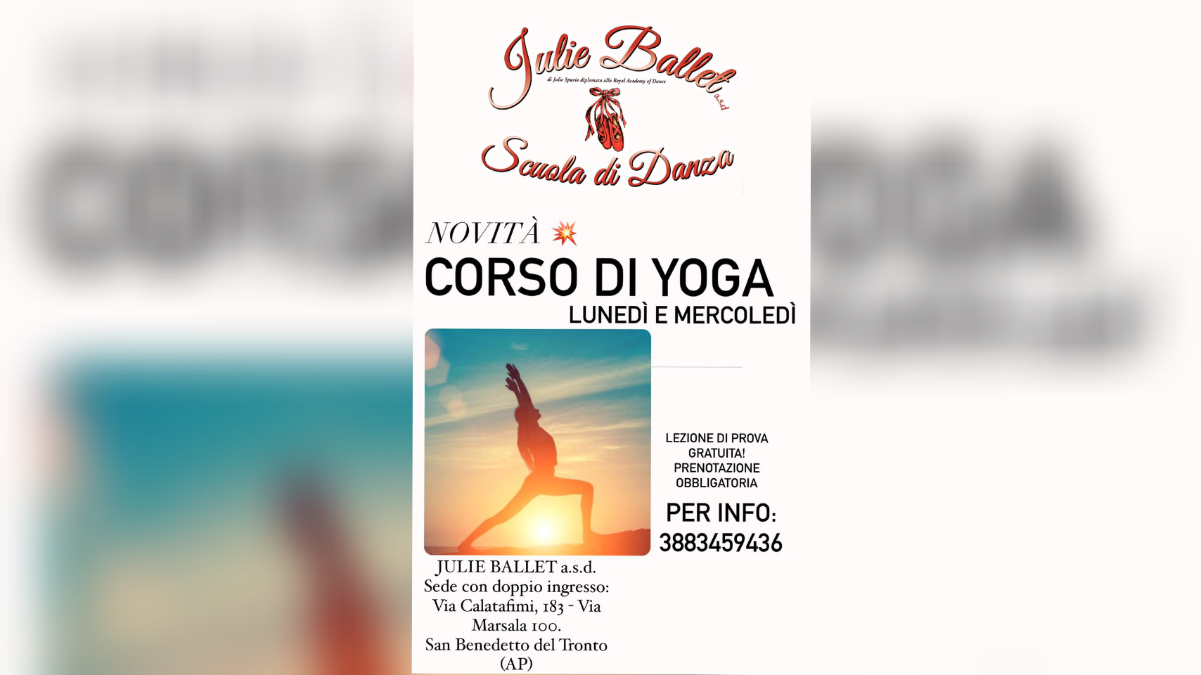 La scuola di danza ha un doppio ingresso, in Via Calatafimi, 183 e in Via Marsala, 100 a San Benedetto del Tronto. Per info: 3883459436.