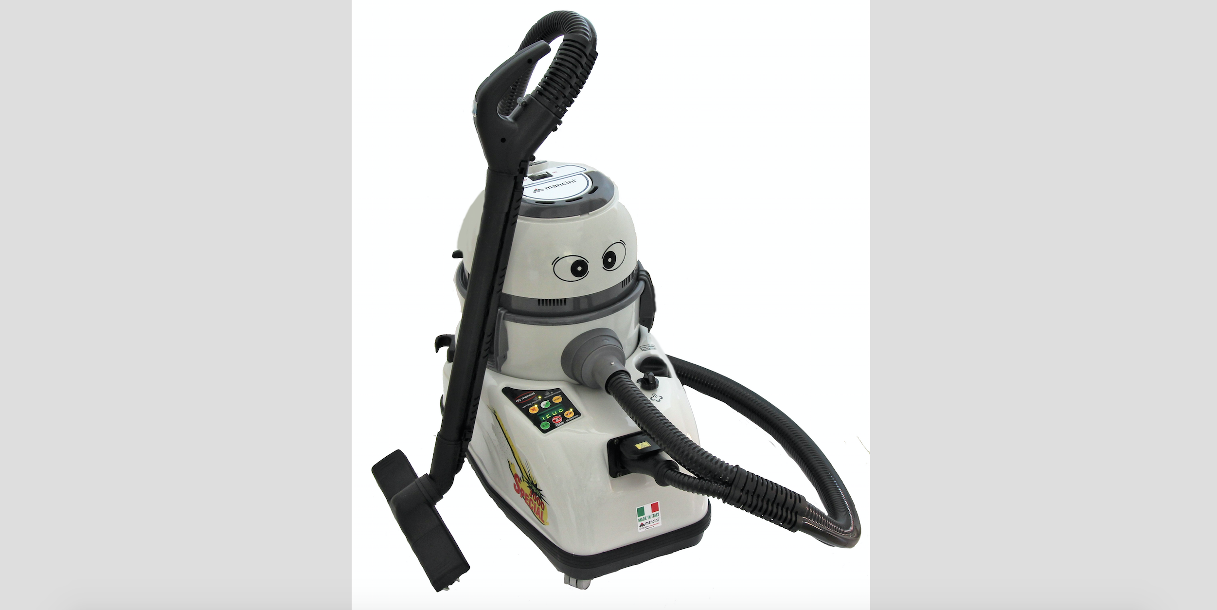 La Super 3000 Special Mancini è la rivoluzione del pulito, 11 funzioni racchiuse in una sola macchina: aspira polvere e liquidi, lava, igienizza, asciuga, vaporizza, umidifica, soffia, stira e purifica l’aria, crea il sottovuoto.