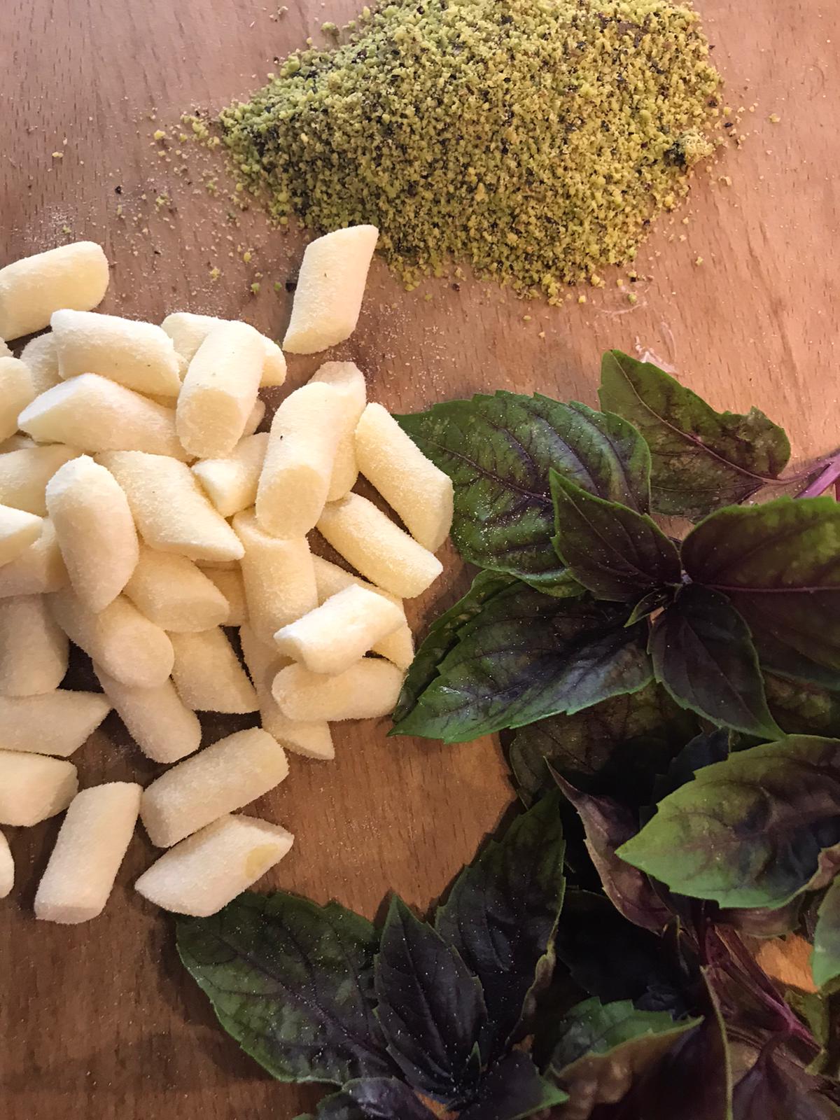 Questa settimana Mani in Pasta propone: gnocchi con pesto di pistacchio, granella e basilico rosso fresco.
