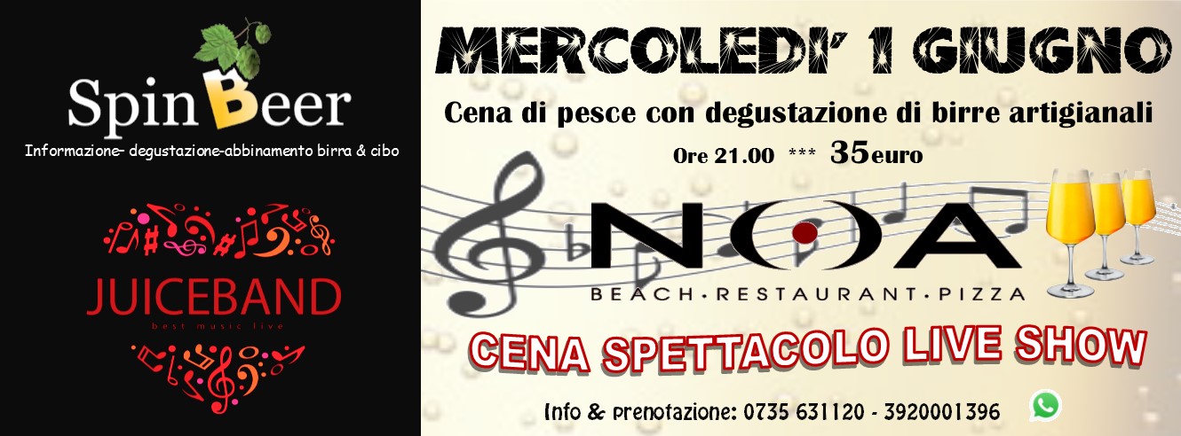 Spin Beer fa tappa al Noa: cena di pesce con degustazione di birre artigianali: 5 antipasti (3 freddi e 2 caldi); tagliolino con battuto di moscardini, gamberi e pomodoro; frittura mista; sorbetto & caffè. In abbinamento 3 calici diversi di birra artiganale appositamente selezionata.