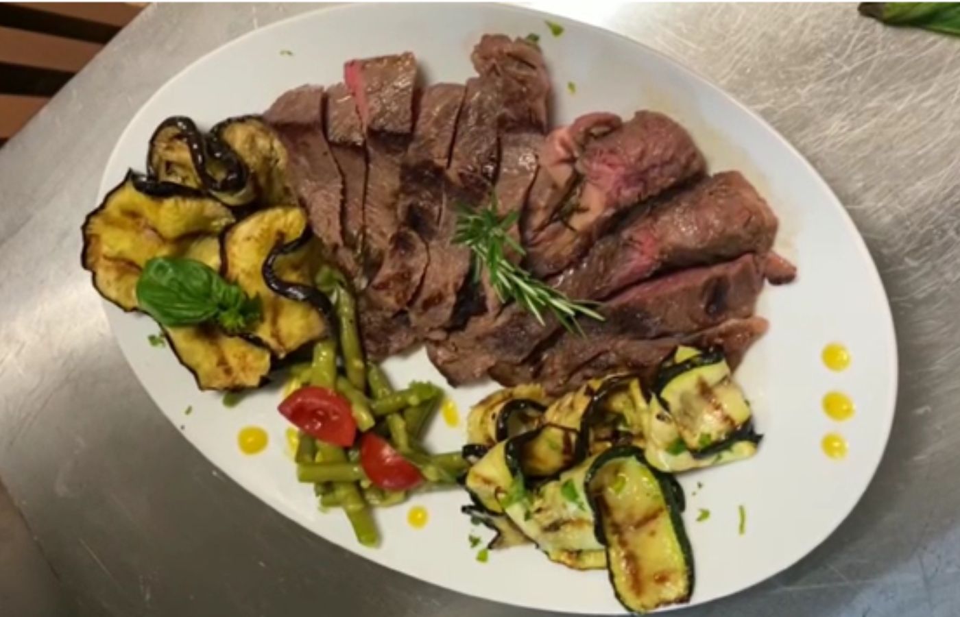 Tagliata al rosmarino CBT con contorno di verdure grigliate.