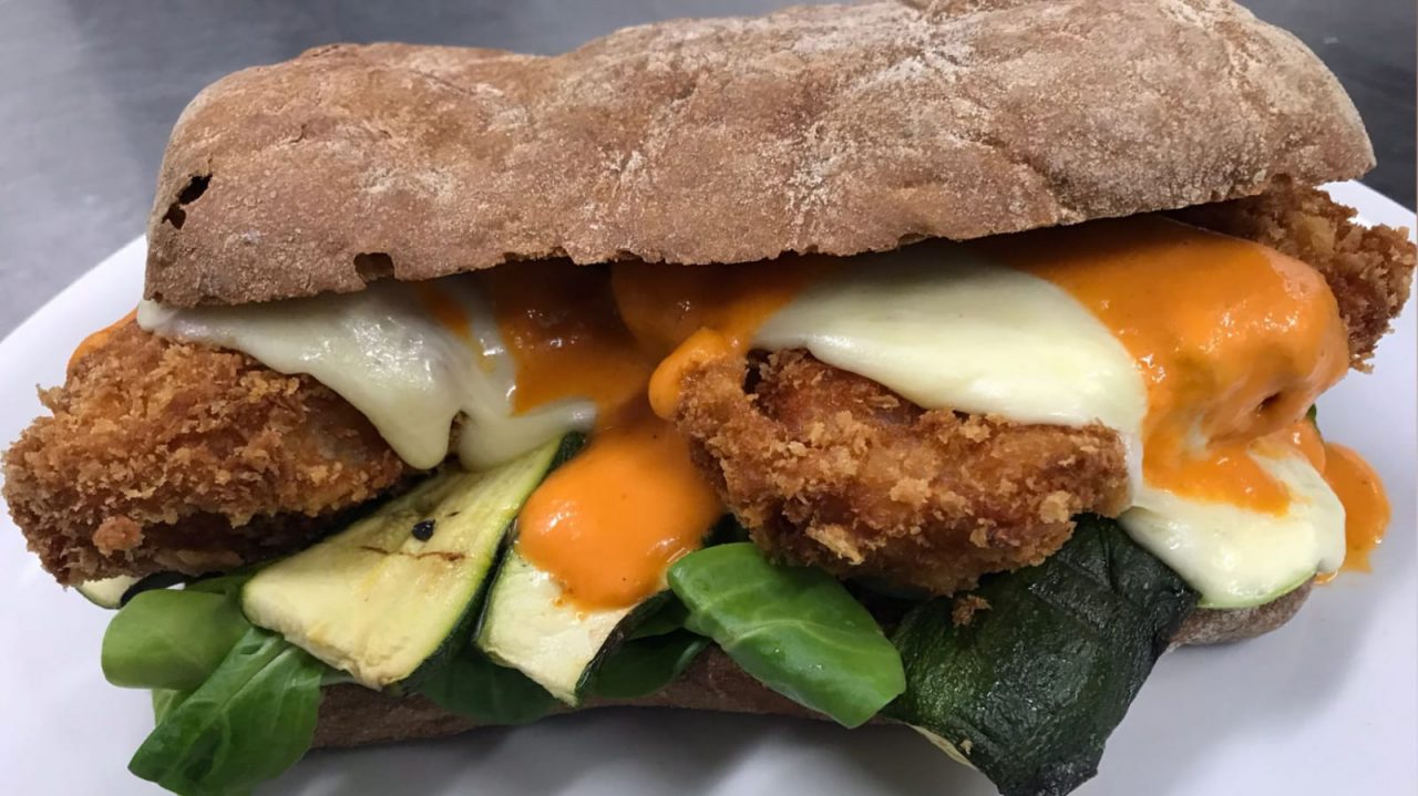 Ecco gli ingredienti: panino impasto cereali, cotoletta di tonno, crema al peperone arrosto, valeriana, zucchina grigliata e scamorza affumicata