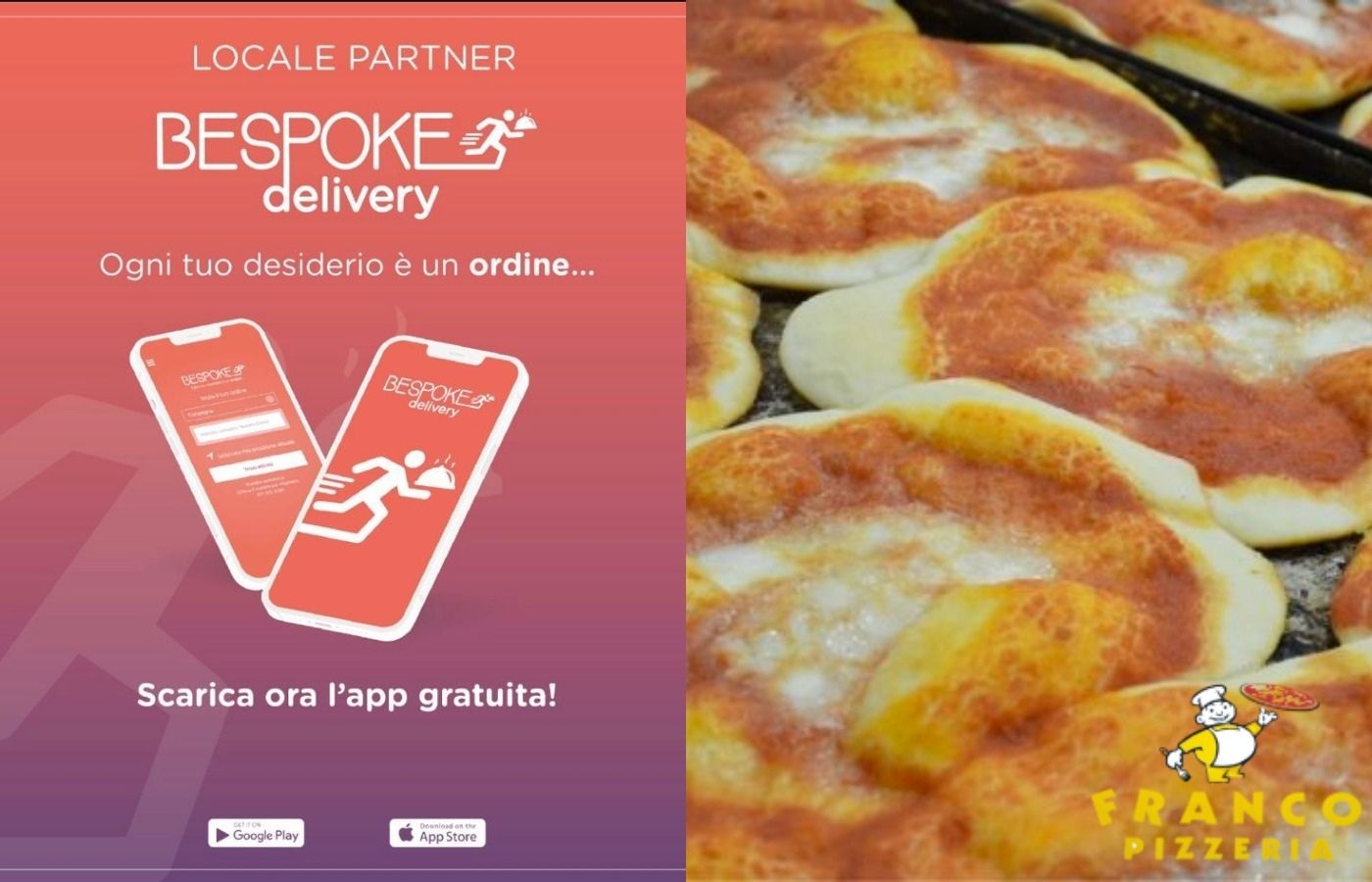 Il servizio è anche delivery. Basta scaricare l’applicazione “Bespoke delivery” dal Play Store o App Store del tuo smartphone e la pizza arriverà in pochi minuti direttamente a casa tua, calda e gustosa come sempre.