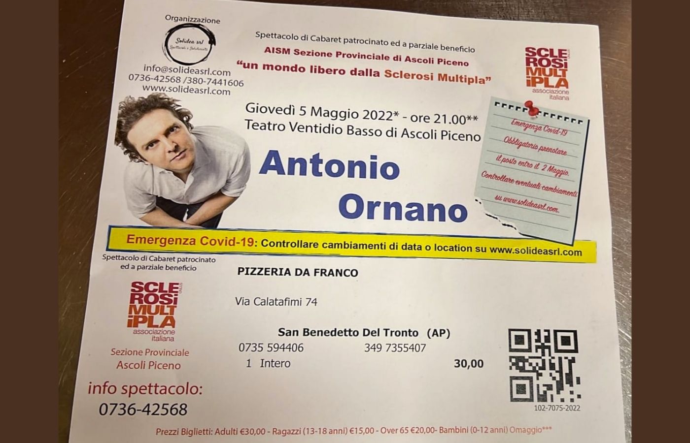 Per ogni 30 euro di spesa presso la pizzeria, riceverai in regalo un biglietto per lo spettacolo del cabarettista di Zelig Antonio Ornano.