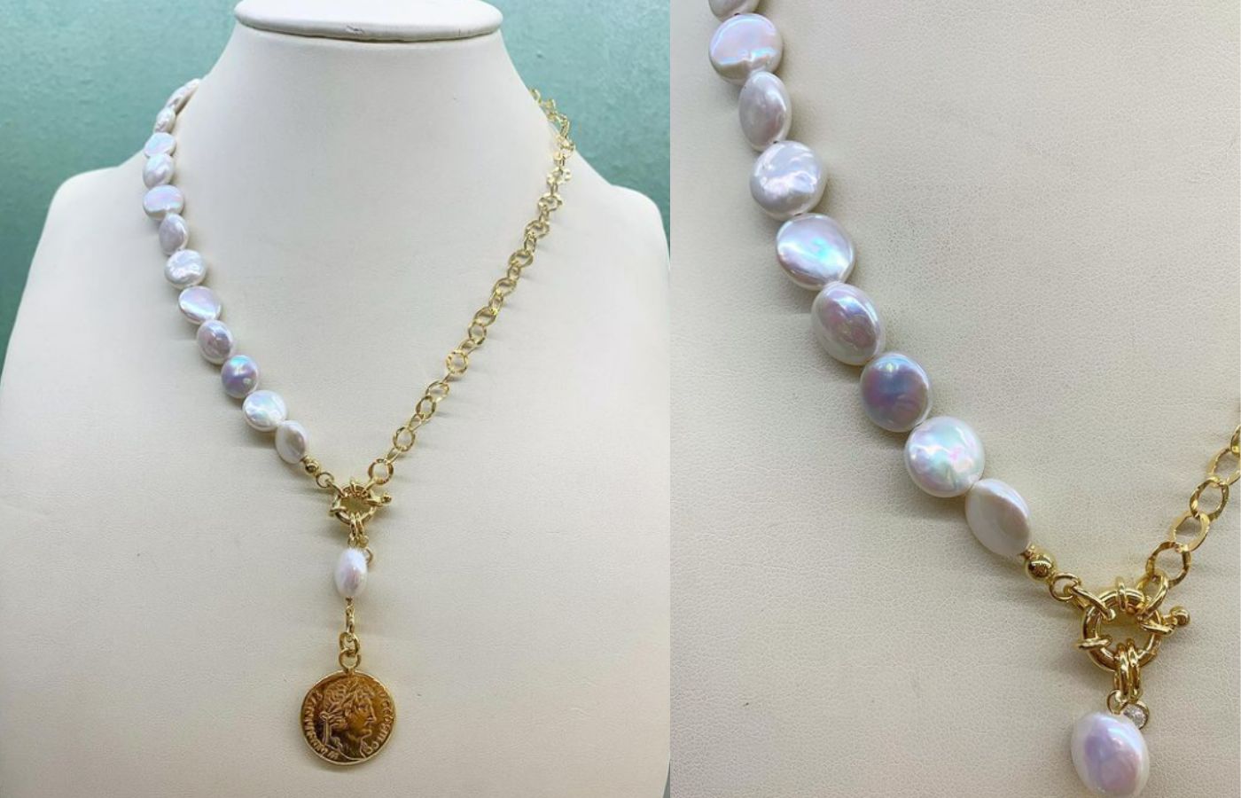 Collana con delle particolari perle di acqua dolce piatte con catenina, chiusura e ciondolo in argento dorato.