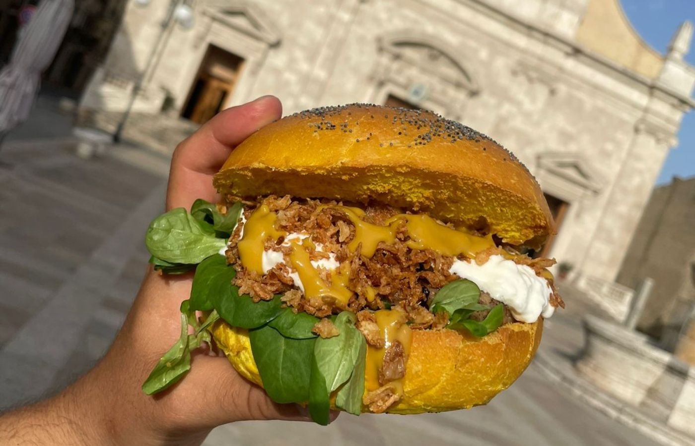 Ecco gli ingredienti: pane alla curcuma con semi di papavero del panificio “Le Fornarine”, burger di scottona della macelleria “Gli Antichi Sapori”, stracciatella, songino fresco, cipolla crunchy e senape al miele.