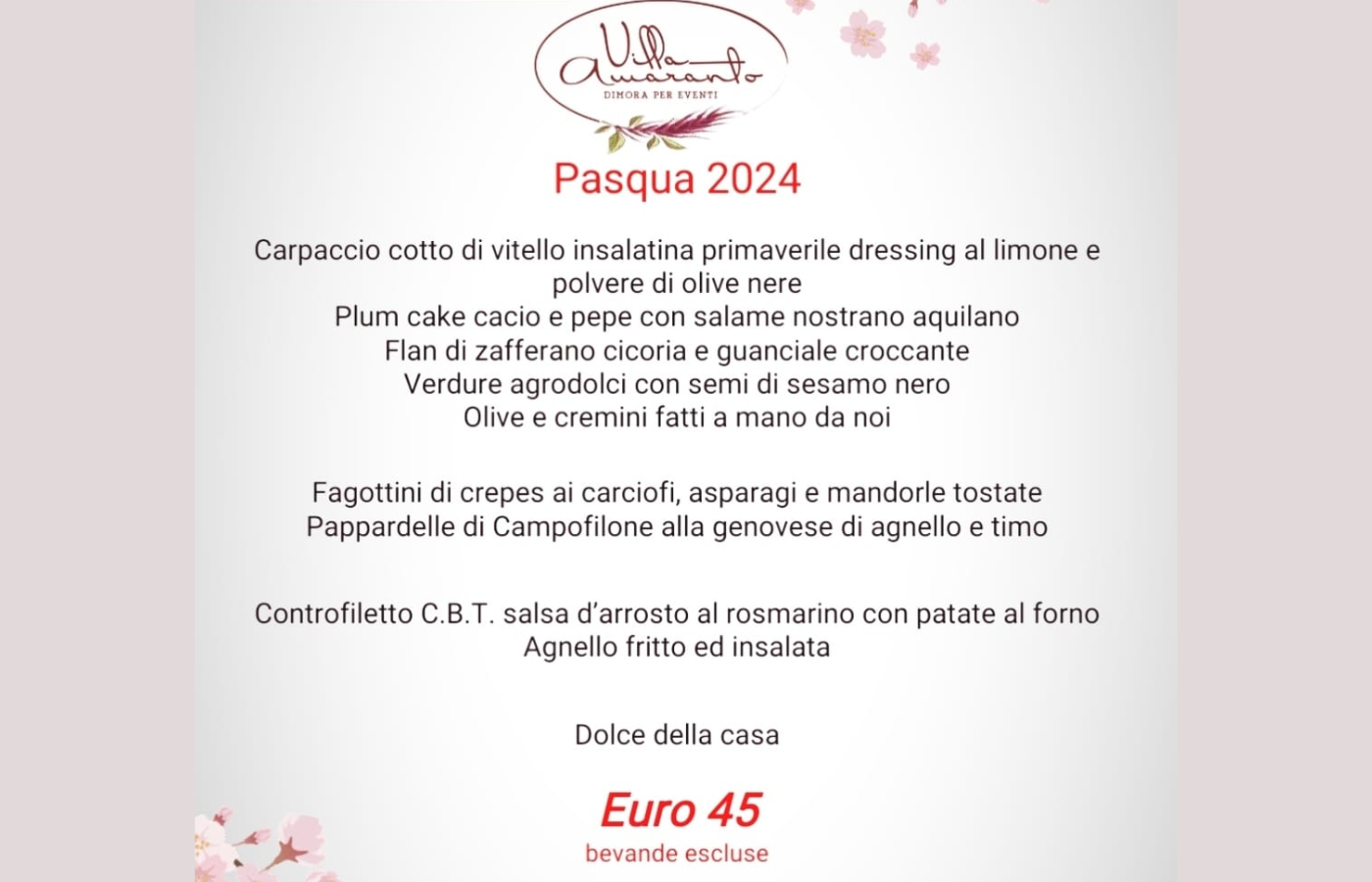 Villa Amaranto ti aspetta per il pranzo di Pasqua, prenota ora al numero 347 229 8778.